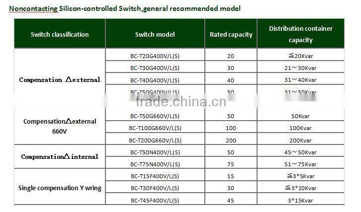 Silicon-controlled switch is Bocheng launched a new generation of independent research and development, adopting high speed CPU control, pulse transformer high reliable trigger, with multiple monitoring protection scheme (current, temperature, lack of phase, the breakdown of real-time monitoring and protecting) and fast switching technology new products. Regardless of the residual voltage of the capacitor for any value, can achieve capacitor branch in real time, without the impact of input and response time for 0-15 msec, instead of the best products of AC contactor and composite switch.