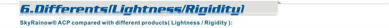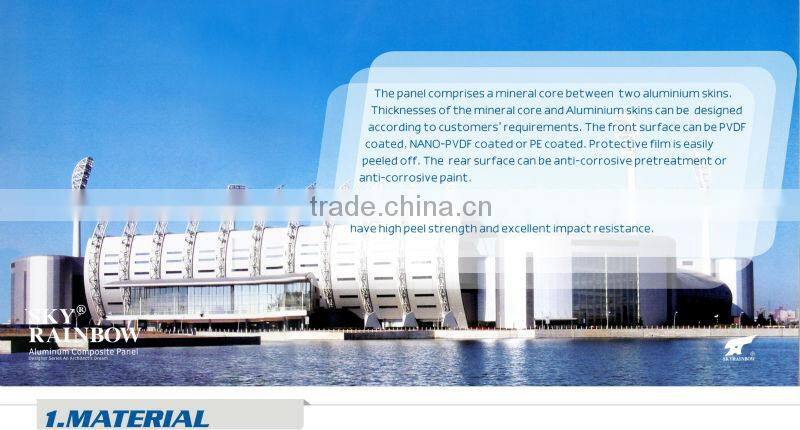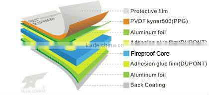 | A) Front : aluminium alloy sheet coated with fluoro-carbon resin (PVDF) or polyestor resin(PE), (Supplier:BEKCER ,PPG). B) Core: nontox low density polyethylene C) Back: aluminium alloy sheet coated with polyester resin painting D) Surface coating thickness: 26μ±1μ in double coating or 32μ±1μ in three coating E) Aluminium alloy: 3003 H24 F) Sheet thickness: 0.3mm,0.4mm,0.5mm | ![]() |
