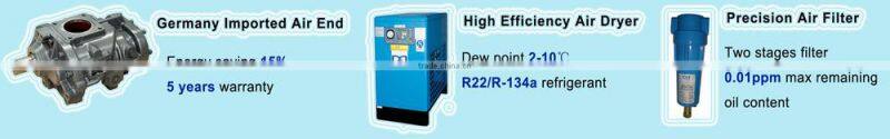 1.The combined screw air compressor integrates the parts including screw air compressor,air dryer,high efficiency air filter and air tank,making it convenient for the user to install,use and move.
