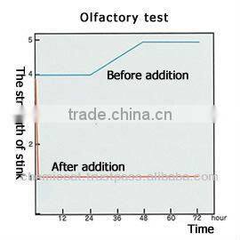 Following the red path,the stink is generated. If Chemicoat’s paint detackifier is added, following the green path, deodorization is realized. | It indicates the difference between before (the blue line) and after (the red line) the addition of paint detackifier. | Not only exact data, but also olfactory test (the right graph) shows obvious effect of deodorization. |