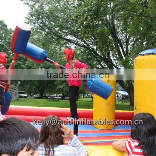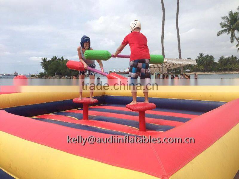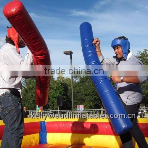Two participants climb on top of a pedestal and nudge, poke, and swat their opponent with oversized foam padded jousting poles. Like "American Gladiator Jousting" losers fall onto an inflated base. This jousting game is very safe and extremely popular with kids and adults