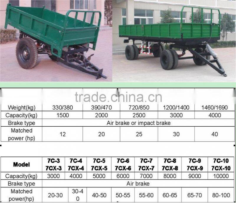 7C series farm trailer is produced under national standard, it is suitable for transporting in farm land, this series trailer is mainly divided into two types: self-discharging and non-self discharging. Self-discharging type consist two kinds of vehicle type: rear-unloading and side-unloading. The machine has dependable quality, strong bearing capacity, it is very easy to maintain. Meanwhile, we also produce other type of trailer as customers` special requirement.