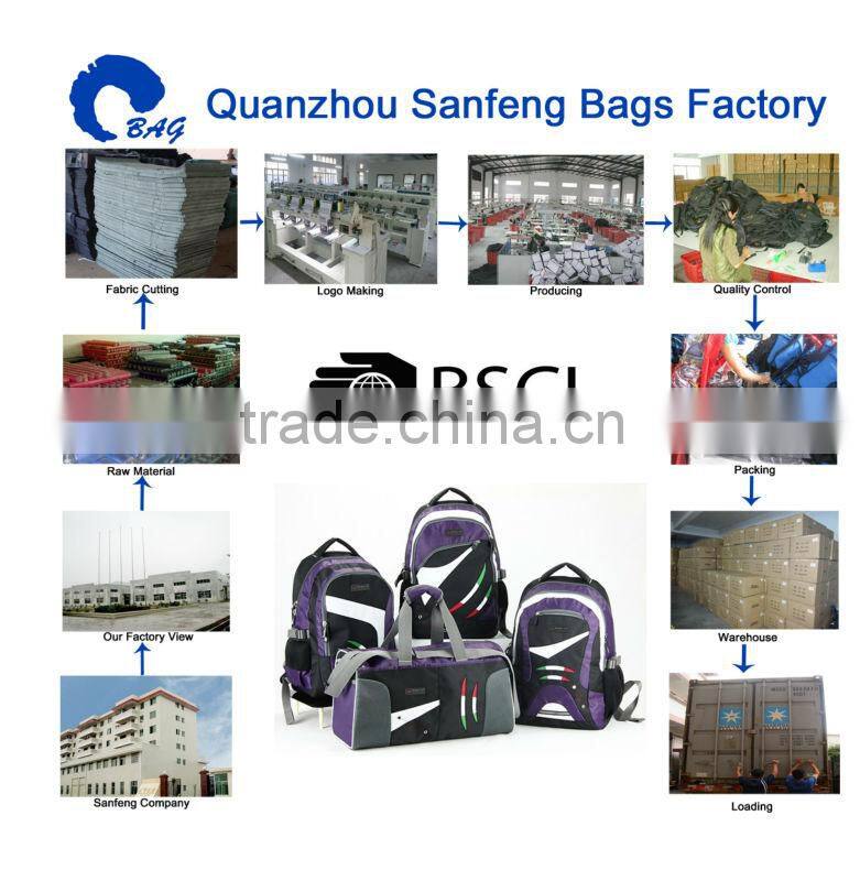 4. You are choosing bags supplier which has below advantages: We have headquarter in Quanzhou, Fujian with an area of 8000sqms, and subsidiary in Longyan,Fujian, with an area of 22,000sqms, and we have over 500 workers.There are different kinds of machines in our factory.Thus we can produce about 250,000pcs of backpacks in a month! a). We have 5 chief designers.We could make sample 100% same as ur artwork or bag true pictures b). We have over 10 R&D staff c). We could add ur any logo(screen printing,heat transfer printing,offset printing,embroidery,rubber logo,metal plate logo,woven label,etc) on bags |