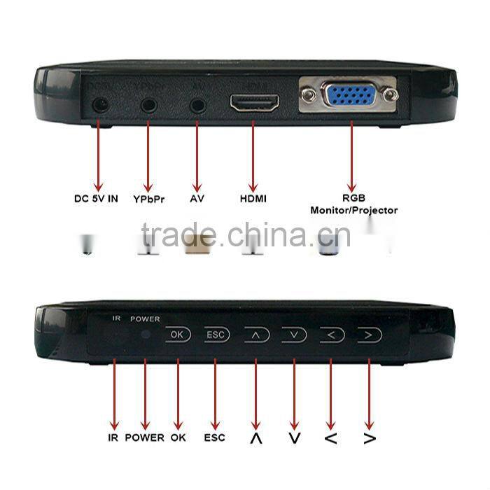 | Accessories | AC adapter (5V/2A), AV cable(Yellow/Red/White), YPbPr cable(Green/Blue/Red), Remote control, User manual. HDMI cable | |
