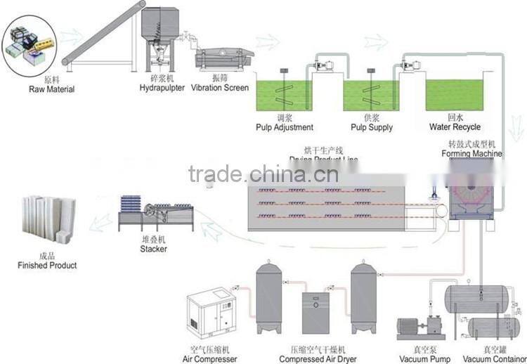 Next by adsorption molding system, paper pulp will be absorbed to molds. Then we have the dewatering processing for forming products on molds.