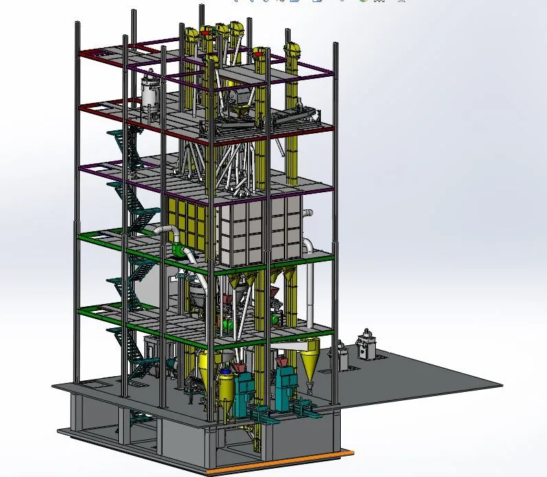 Poultry feed product line include 6 process section: raw material reception and cleaning, crushing section, mixing section, pelletizing section, cooling and crushing section, screening and final package section. Auxiliary equipment include oil feed system, steam supply system and air compress system.