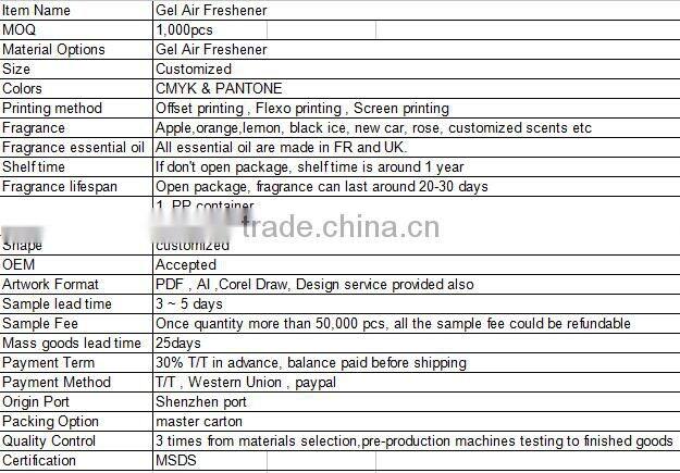 Wholesale Fragrance Water-based Custom Hotel or Car Solid Gel Air Freshener