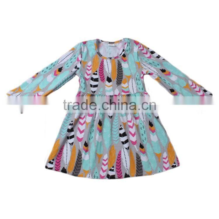 2016 Kids Wholesale Clothing Colorful Feather Print Latest Dress Designs Frock Design for Baby Girl