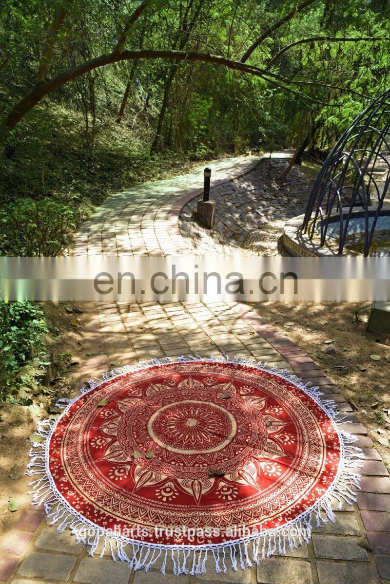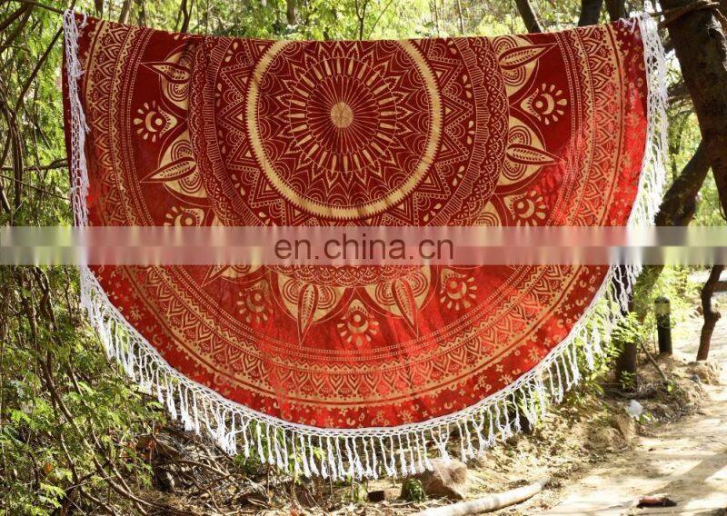 Indian Latest 72" Round Tapestry Maroon Gold Ombre Mandala Design Beach Towel Wall Hanging White