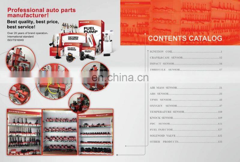 Our main products are: crankshaft sensor, camshaft sensor, oxygen sensor, knock sensor, ABS sensor, air flow meter, ignition coil, injector, valve, switch, motor, fuel pump, the clock spring, throttle assembly such as tens of thousands of products, according to the domestic and international relevant standard IS0 / TS l6949:2009 quality management system production, after 20 years of sales management, products not only spread all over the domestic and exported to Europe, the America, the Middle East, Africa and southeast Asia and other countries and regions.