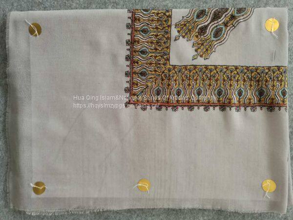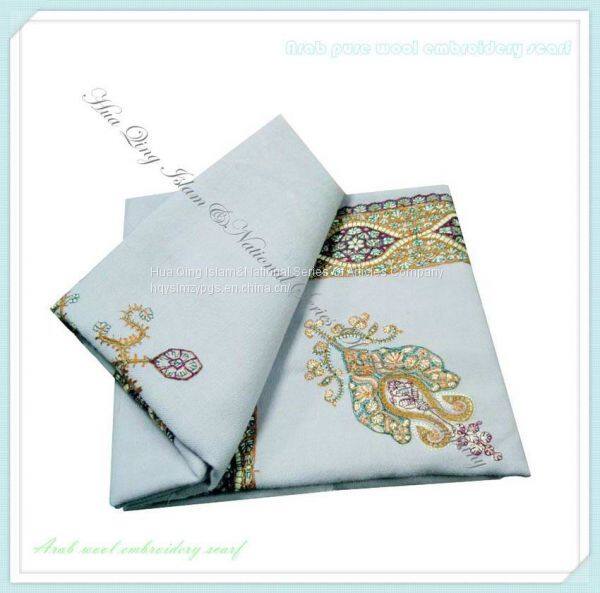 Arab wool embroidery scarf,made in 30% wool blend with 70% acrylic,fine embroidery, many flower patterns for choosing,it's deeply favored by upper circles of Oman,Yemen,Saudi and Gulf countries. Size:50"X50",packaging:1pcs/bag,20pcs/box,120pcs/carton. We have some stock now. Meanwhile,our company also supply Arabia pure cotton kerchief,Arafat scarf,Arabian mercerized cotton turban,Arabian pure cotton scarf,Arab wool acrylic jacquard scarf,Voile male lace scarf and other Arabian scarves.