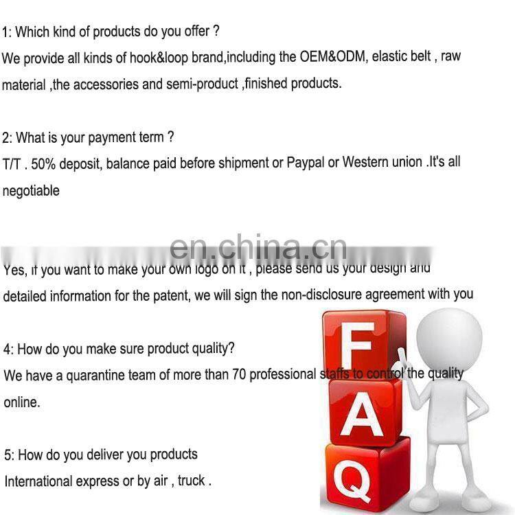 Shenzhen Fucheng Hook & Loop Co., Ltd was established in 1998 and registered in 2007. We are specializing in manufacturing all kinds of hook and loop products, loop fabric, elastic hook and loop, medical hook and loop elastic straps, hook and loop cable tie, hook and loop ski straps, book strap, sports wrist/armband, hair accessories, neoprene products , custom promotional gifts and webbing tape in China.