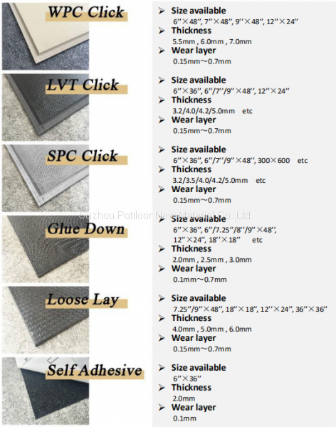 Wear layer | 0.15mm-0.7mm | 0.15mm-0.7mm | 0.15mm-0.7mm | 0.1mm~0.7mm | 0.10mm |