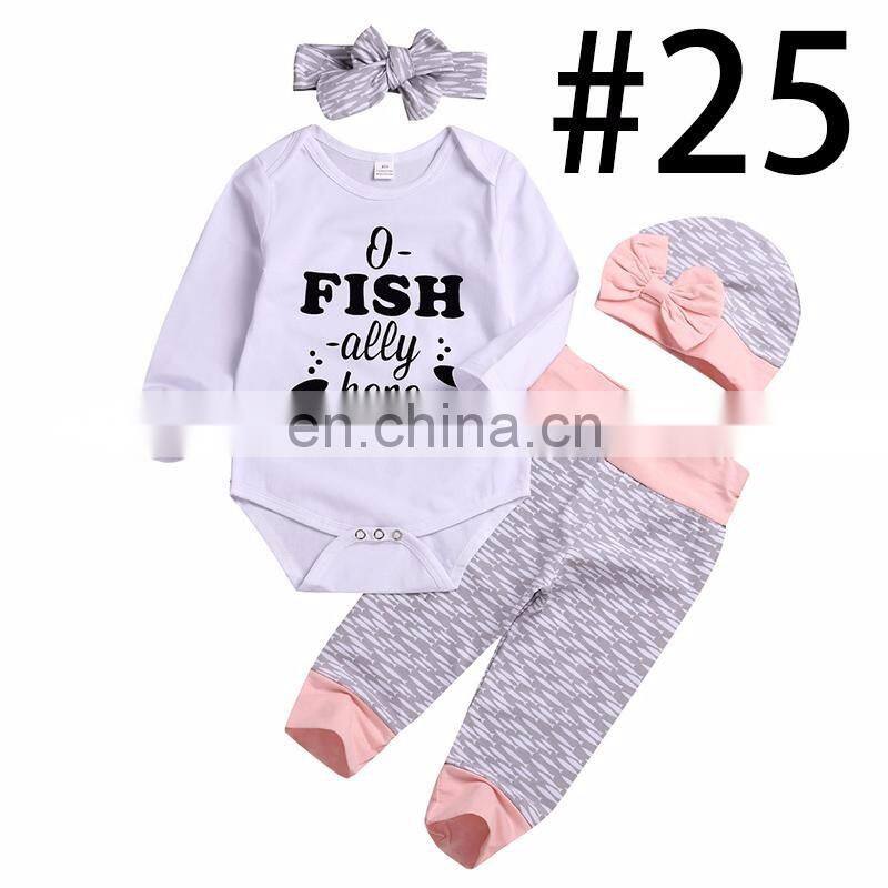 "Fish -ally Here" 2019 White Baby Romper & Ocean pp Pants & Bow Hat & Headband 4pcs Set
