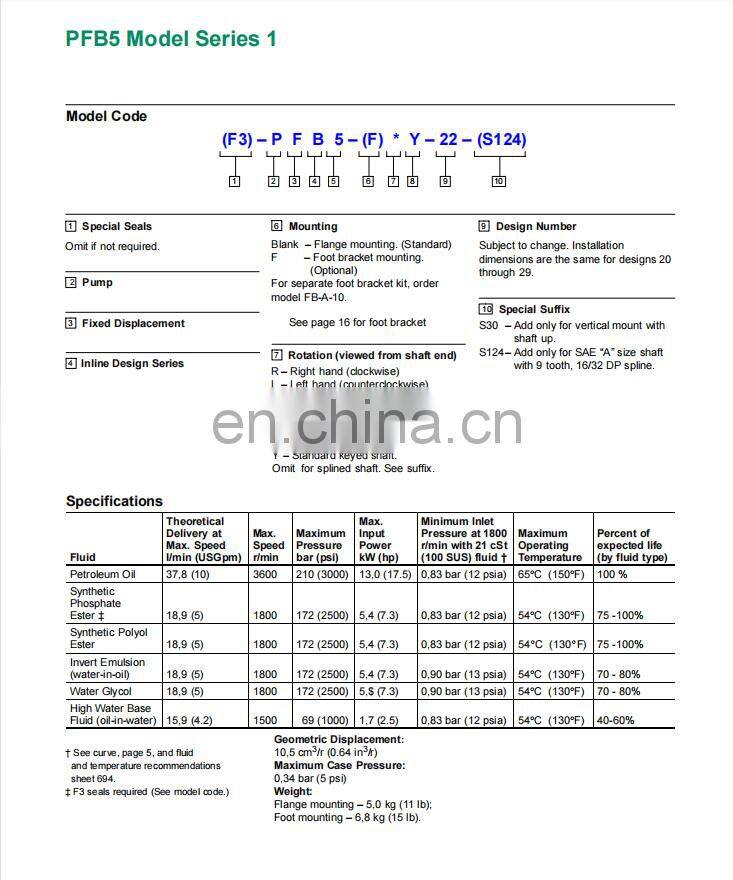 VICKERS PFB PFB5 PFB10 PFB20 PFB45--R/L/U/RY/LY/UY-20/22-S30/S124 Series Fixed Displacement Piston Pump PFB10RS31S124