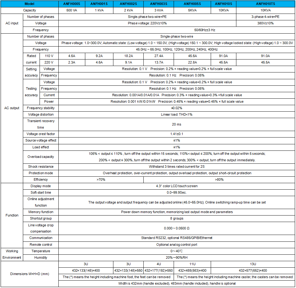 This ANFH series AC power supply adopts digital technology and IGBT intelligent output with pure output waveform. The power supply has the ability to withstand impact of 3 times the rated current, featuring strong load adaptability, suitable for various impact loads such as motors and air conditioners, with good dynamic characteristics.