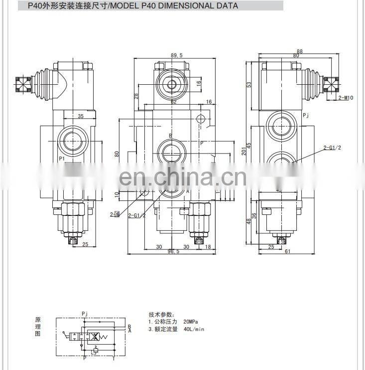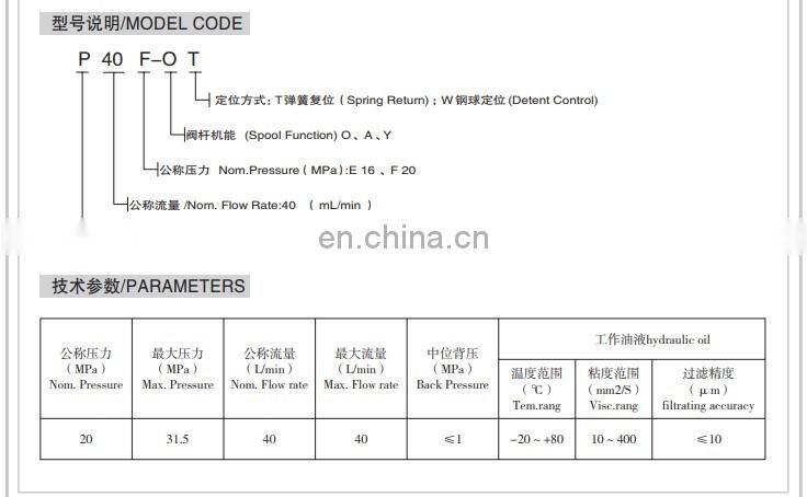 P40 series valves with middle-high pressure monoblock construction is developed based on Europe technology. * Inner check valve: The check valve inside the valve body is to insure the hydraulic oil not to be returned. * Inner relief valve: The relief valve inside the valve body is able to adjust the hydraulic system working pressure. * Oil way: Parallel circuit, power beyond option. * Control Way: Manual control, pneumatic control, hydraulic and electric control for optional. * Valve construction: monoblock construction, 1-7 levers. * Spool Function: O,Y, P,A. * Option: Hydraulic lock is available to be added on A and B port. * Available with manual, pneumatic control, electric and pneumatic control, hydraulic and electric control and etc. The valve is widely used in hydraulic systems of construction machinery such as forklifts, sanitation trucks, and small loaders,etc. |