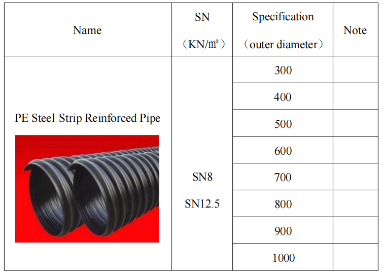 There are a total of 16 products of PE steel strip reinforced pipes, divided into 8 specifications from dn300-dn1000, and divided into two grades: SN8 and SN12.5 according to ring stiffness. Used in municipal and building rainwater pipes, underground drainage pipes, sewage pipes, etc.