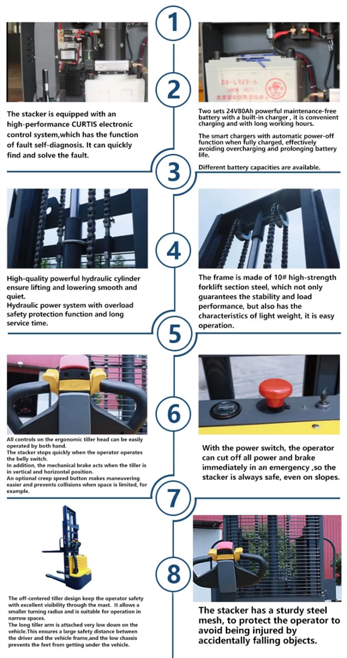 SHANDING offer a safer alternative to rider forklifts for small to medium sized facilities. Maximum travel speed is a reasonable walking pace of just over 3mph and with rearward facing forks during most travel, a walking operator has unimpaired vision and greater time to react. Switching to Walkie Counterbalanced Stackers can greatly reduce workplace injuries and help to reduce the high costs associated with them, including liability insurance, Workman’s Comp claims and operator training