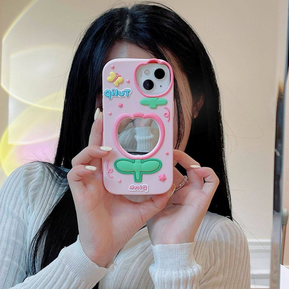 Stylish Catone Cute Pink Girly Mirror Tulip Silicone Shockproof Protective Phone Cover Case For IPhone 11 12 13 14 15 Pro Max