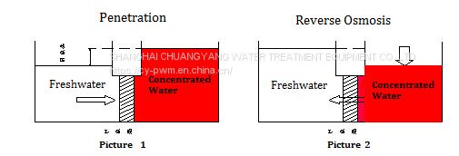 Технология ОБ - это мембранная сепарация и фильтрация, которая использует разность давлений в качестве энергии, размер пор которой составляет до нескольких нанометров (1 НМ = 10-8 метра). При определенном давлении молекулы воды могут проходить через мембрану ОБ, а неорганические соли, тяжелые ионы, органические вещества, коллоиды, бактерии, вирусы и другие примеси в воде не могут проникнуть через мембрану ОБ, поэтому проницаемая чистая вода и неконцентрированная вода будут строго разделены. Схема работы мембраны ОБ приведена ниже :