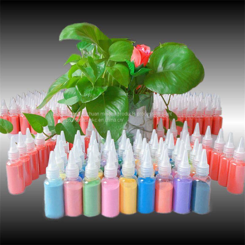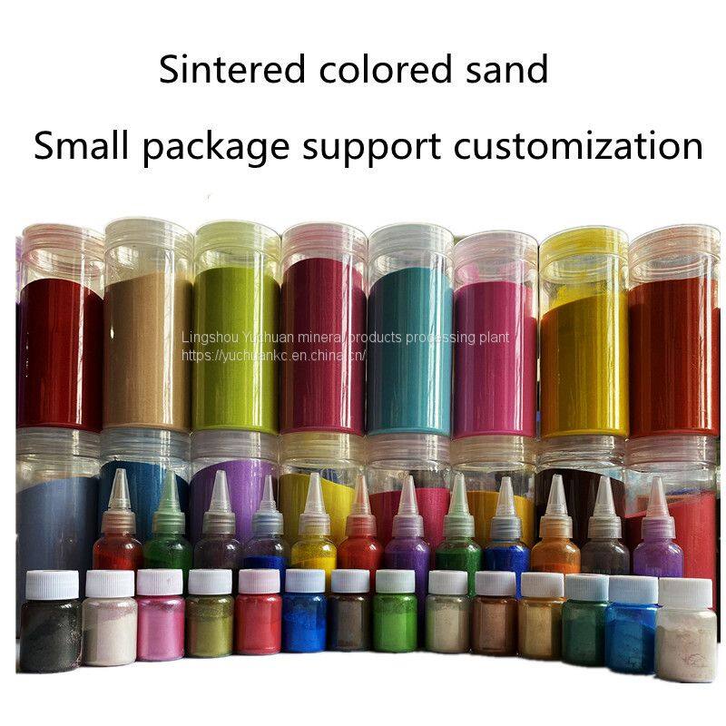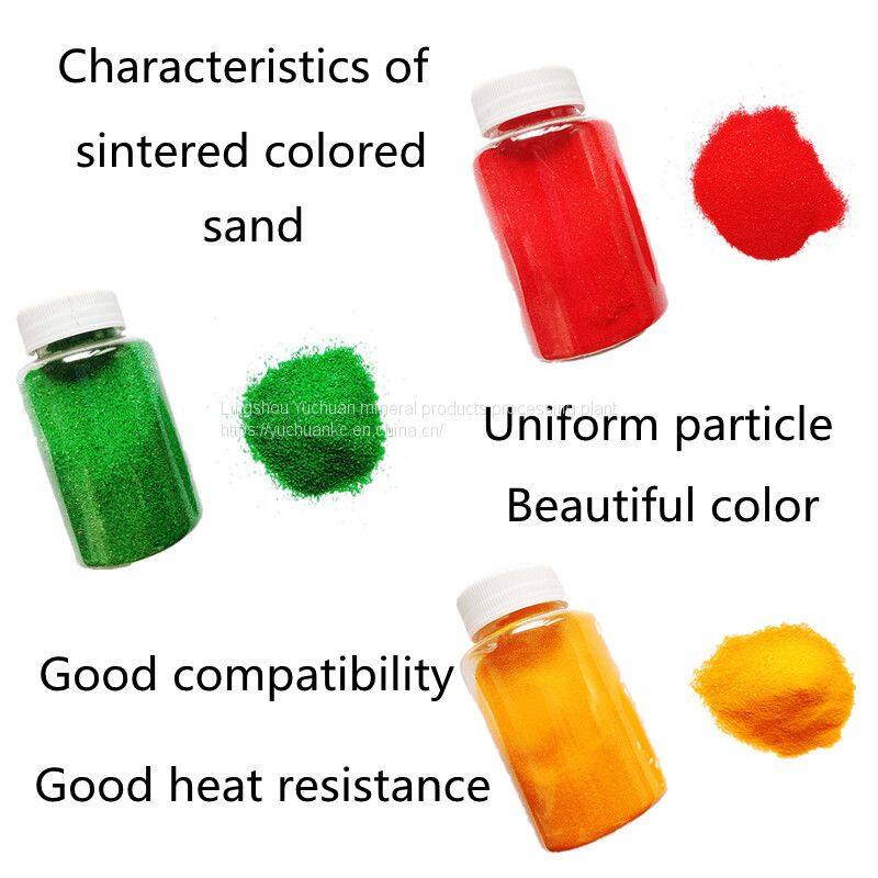 Цветной песок сейчас делится на натуральный цветной песок, спеченный цветной песок, временно окрашенный цветной песок и постоянно окрашенный цветной песок. Его характеристики: яркий цвет, устойчивость к кислотам и основаниям, устойчивость к ультрафиолетовому излучению и невыцветание. Натуральный цветной песок: он получается путем измельчения природных руд и не выцветает, но содержит много примесей цветов; Временно окрашенный цветной песок: яркий цвет, легко депигментируется.