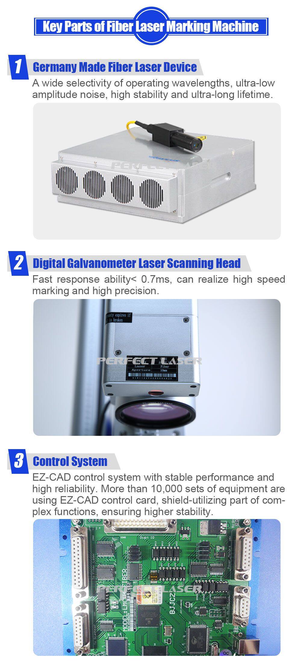 Лазерный маркер на волоконном лазере от Perfect Laser использует самые передовые международные технологии, а лазерный источник - волоконный с технологией немецкой компании IPG. Срок службы может достигать 100 000 часов, и в течение 8 - 10 лет не требуется никаких расходных материалов и технического обслуживания. Диодное сопряжение с волокном для осуществления накачки. Накачивающее излучение вызывает инверсию населенности частиц, что позволяет излучать высококачественный лазерный луч. Это лучший выбор для клиентов, у которых есть особые требования к минимальному и наилучшему лазерному лучу и символу.