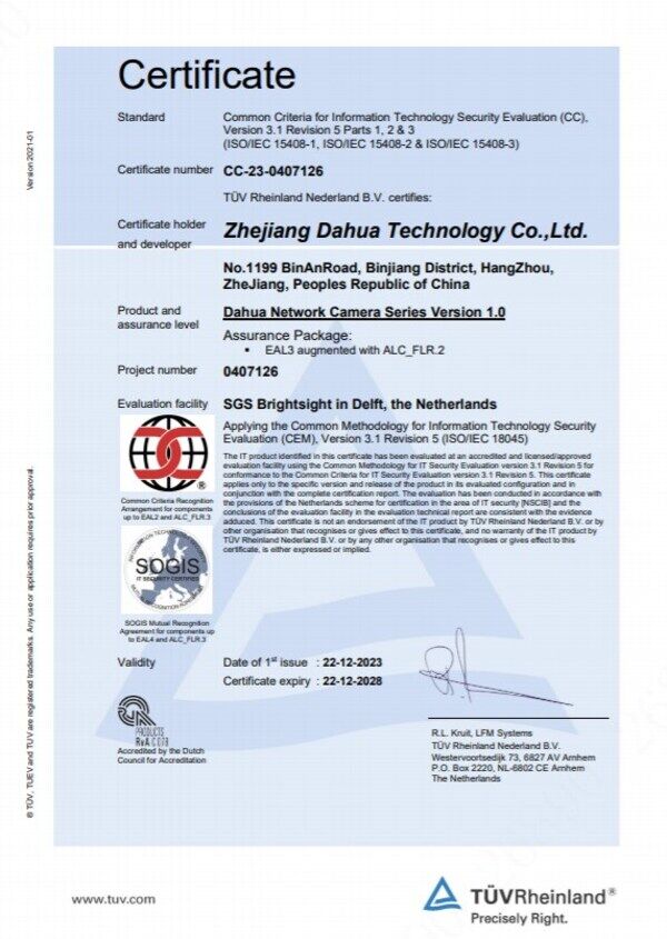 The certification process involves comprehensive testing and evaluation of Dahua's development environment, production environment, supply chain, vulnerability assessment, personnel security, as well as many other aspects. The security evaluation is completed by SGS Brightsight, a globally renowned security assessment laboratory in the Netherlands and approved by the Netherlands Scheme for Certification in the Area of IT Security (NSCIB).