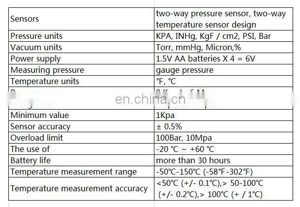 - Der Kältemittelzähler und der Vakuummeter können gegeneinander umgeschaltet werden.- Gemäß US NIST-Standard ist eine Datenbank mit 88 Arten von KälteDrücken und den entsprechenden Verdampfungstemperaturen eingebaut.