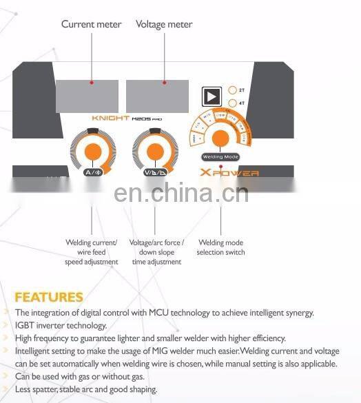4. Configuración inteligente para hacer que el uso de la soldadora MIG sea mucho más fácil. La corriente y el voltaje de soldadura se pueden configurar automáticamente cuando se elige el alambre de soldar, mientras que la configuración manual también es aplicable.