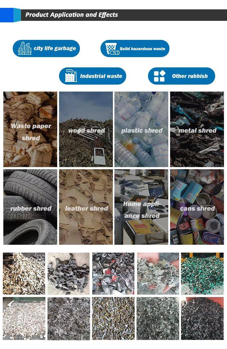 : materiales de embalaje, cartón, etc. 6. Procesamiento de metales: plomo, aluminio, cobre, etc. 7. Procesamiento de biomasa agrícola y forestal: arroz, trigo, tallos de maíz y ramas de jardín, etc. 8. Procesamiento de caucho de neumáticos: caucho de neumáticos, papel de desecho industrial, barriles de metal, acero desechado, residuos electrónicos, barriles de plástico, grandes piezas de plástico, equipos electrónicos, desechos de madera