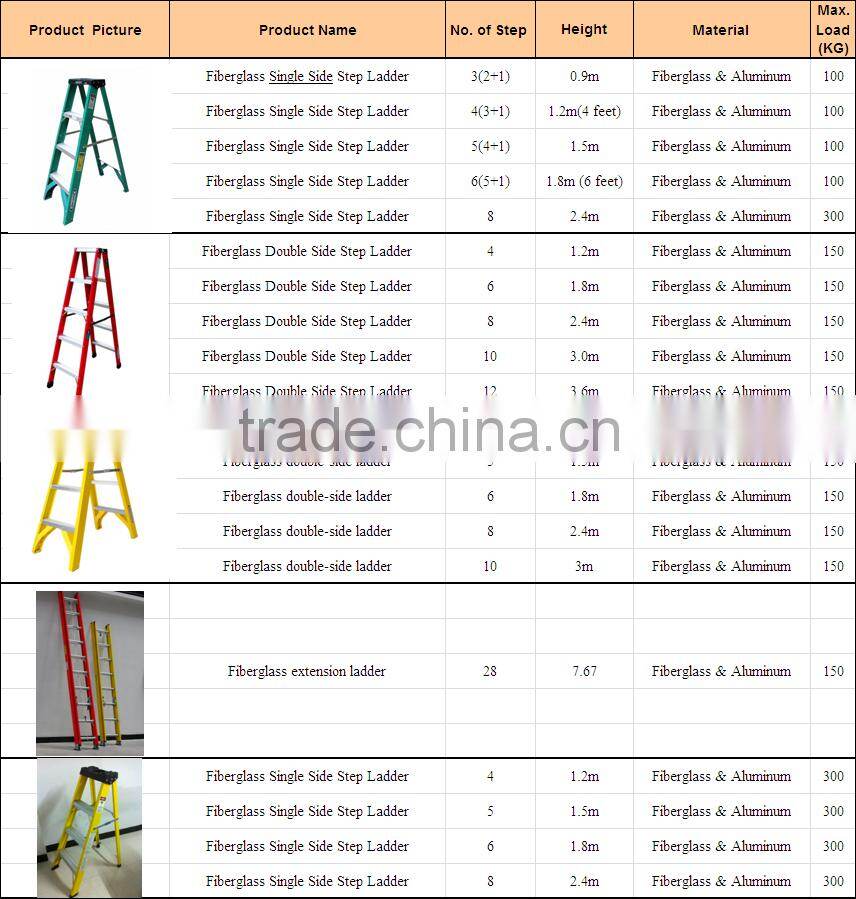 | Fiberglass extension ladder | 28 | 7.67 | Fiberglass & Aluminum | 3mm | 30cm | 150 | 23 |
