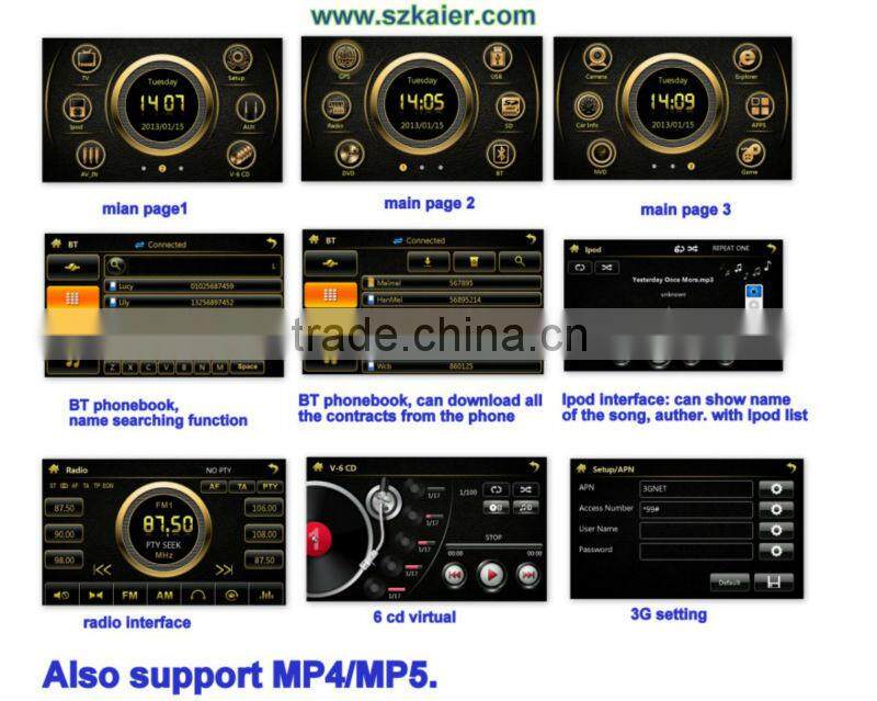 | Combination | Bluetooth-Enabled, Built-in GPS, CD Player, MP3 / MP4 Players, Radio Tuner, Touch Screen, TV, Other, Bluetooth-Enabled, Built-in GPS, CD Player, MP3 / MP4 Players, Radio Tuner, Touch Screen, TV, DVB-T/6CD/PIP | Certification | CCC/CE/FCC/SASO | |