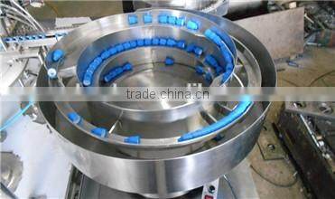 This Automatic Electronic Cigarette Liquid Filling and Capping Machine is mainly available to fill different liquid into various round and flat plastic or glass bottles with the range from 5 to 50ml.High precision cam provides a regular plate to position,cork and cap,accelerating cam headsgoing up and down ;constant turning arm screws caps;creepage pump measures filling volume;and touch screen controls all action. No bottle no filling and no capping. If there is no plug in the bottle, it must not cap until having been detected plug in the bottle. The machine enjoys high position accuracy, stable driving, precise dosage, and simple operation and also protects bottle caps.