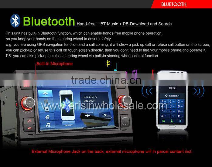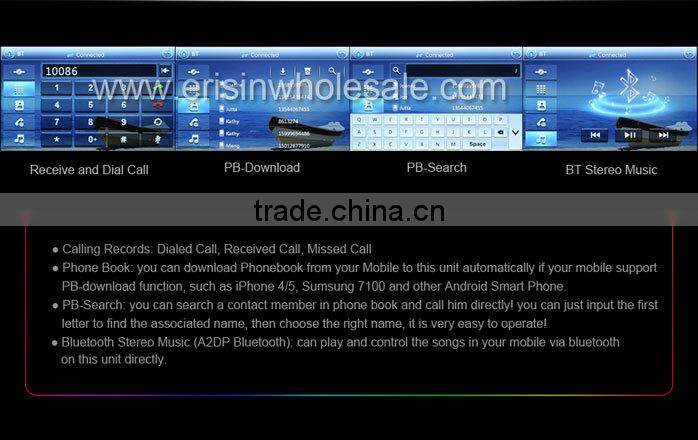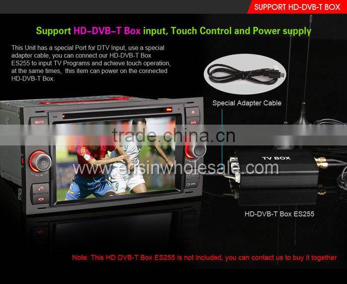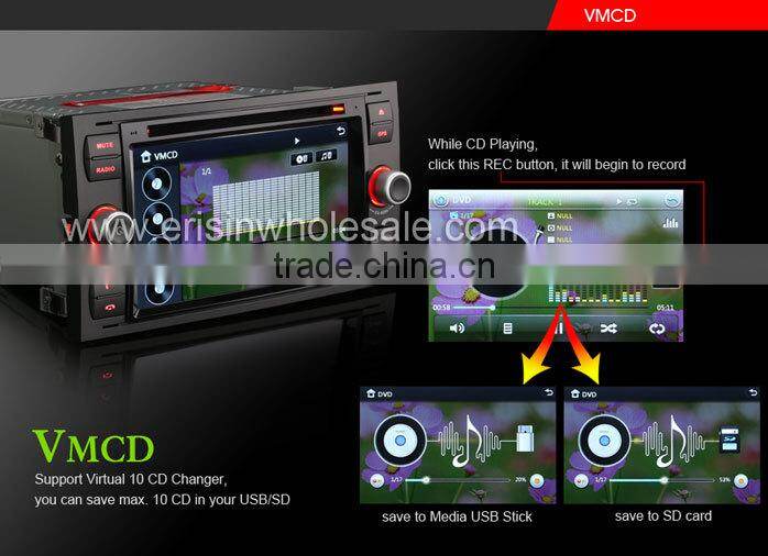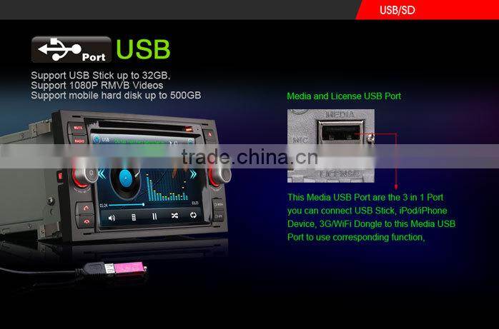 This car dvd player is the new All-in-One Design for old FORD, Beautiful and fashionable Win8 UI, MTK3360 800MHz CPU, 256MB RAM, support 1080P RMVB Video, support the newest 10-Band EQ, support 3G WCDMA Internet, VMCD---Virtual 10 CD Changer, Bluetooth PB-Download and PB-Search, Steering Wheel Control, built-in 6 Games, Calculator, 110 Start Unit Logos, 10 internal wallpapers and can update user's wallpaper, external Microphone incl., show and play iPod/iPhone4/5/iPad playlists, Support Portable Hard Disk up to 500GB, Car Recorder and Digital TV Box input + power supply + Touch control