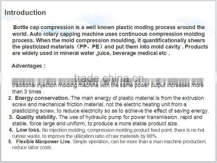 nd putting them into the molding chamber uniformly.The bottle cap making by this type of machine will be without Injection gate