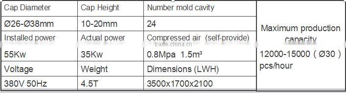 Bottle cap compression is a well known plastic moding process around the world. Auto rotary capping machine uses continuous compression molding process. When the mold compression moulding, it quantificationally shears the plasticized materials(PP,PE)and put them into mold cavity . Products are widely used in mineral water ,juice, beverage medical etc . Adventages : 1. High Efficiency. Using the successive cyclic operation, compared with the traditional injection molding machine with the same power output increases more than 3 times . 2. Energy conservation. The main energy of plastic material is from the extrusion screw and mechanical friction material, not the electric heating unit from a plasticizing screw, to reduce electricity so as to achieve the