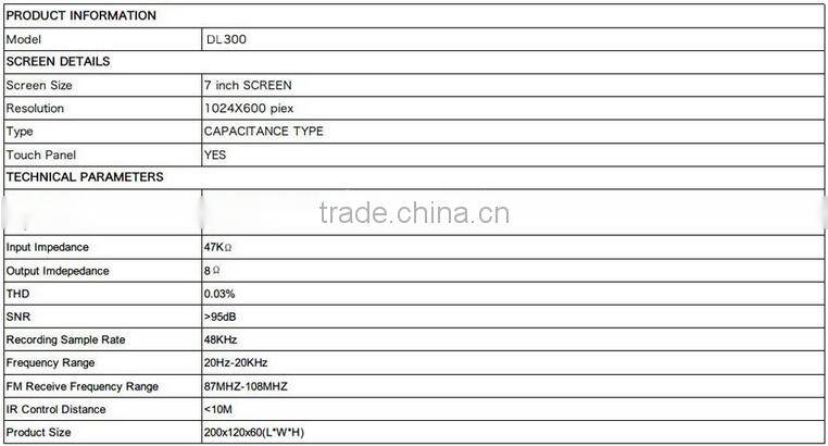 1.Beautiful outlook:simplicity and nobility,7" touch screen,TFT 1024*600 HD resolution screen,Hi-Fi stereo,