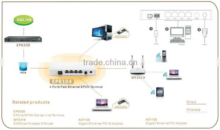 | Interface | 1 * SFF/SC PON port 4 * 10/100Mbps auto-negotiation and MDI/MDIX RJ45 LAN port |