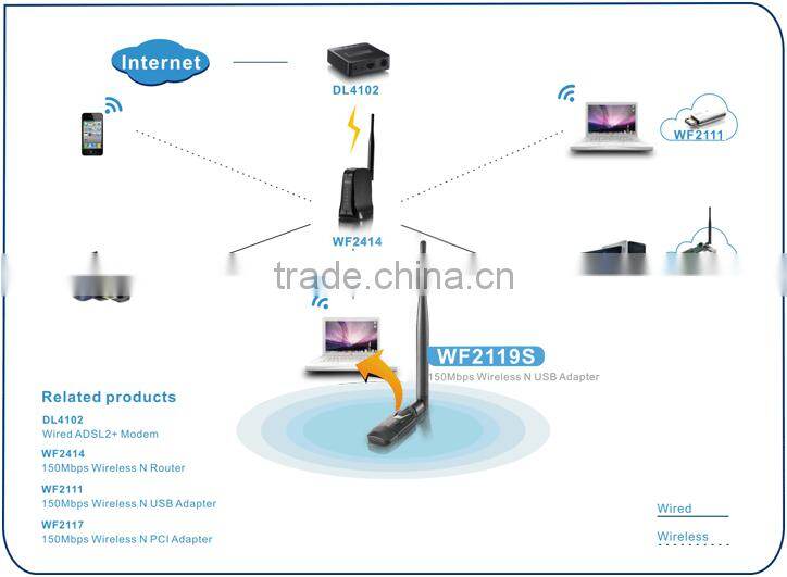 The netis WF2119S is designed to connect a desktop or notebook computer to a wireless network and access high-speed Internet connection. It's compatible with 802.11b/g/n devices and provides the wireless transfer speed up to 150Mbps, offering a better performance on web surfing, emailing, file sharing, and online chatting. It features with a 5 dBi detachable antenna providing better coverage and allowing for stronger antenna upgrades. Moreover, you can easily setup a secure wireless connection in a snap with the WPS button .