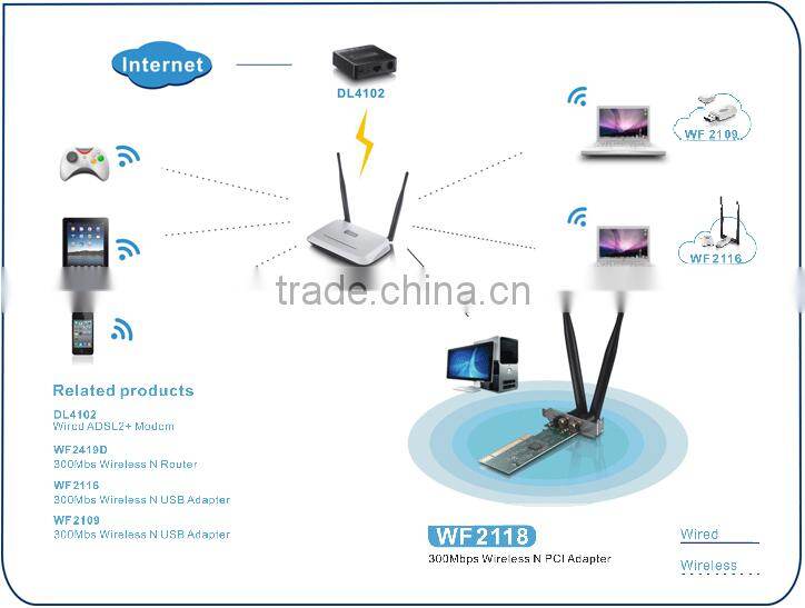 The netis WF2118 300Mbps Wireless N PCI Adapter is a 802.11n wireless client which provides high performance wireless connectivity for your desktop computer. With good compatibility WF-2118 can fit with any standard 32-bit PCI slot and complies with IEEE802.11b/g/n standards.