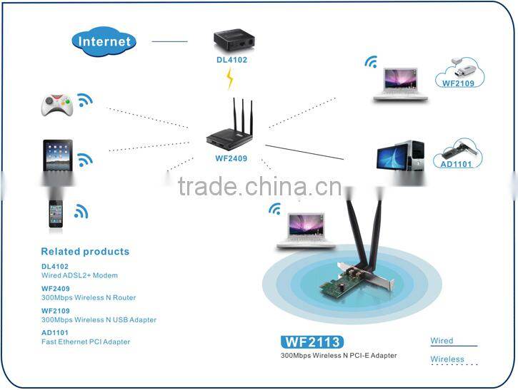 The netis WF2113 300Mbps Wireless N PCI-E Adapter is a 802.11n wireless client which provides high performance wireless connectivity for your desktop computer. With good compatibility WF-2113 can fit with any standard PCI-E slot and complies with IEEE802.11b/g/n standards.