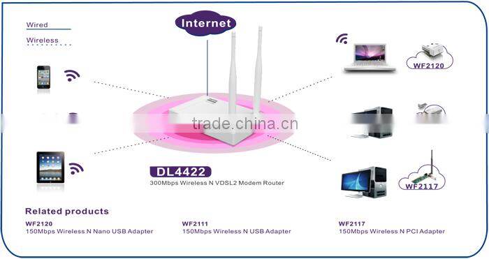DL4422 is a VDSL wireless router. It supports VDSL2 standard, and is compatible with ADSL2+/ADSL2/ and ADSL Standard. VDSL2 supports upload and download speed up to 100 Mbps (whereas ADSL maximum standard is only 24Mbps download speed). DL4422 is also a 300Mbps Wireless router, which provides 4*100Mbps RJ45 ports. This combination of wired and wireless technology on a shared network will satisfy Users' needs, ensuring a reliable connection while web streaming, online gaming, internet calling, and HD video streaming.