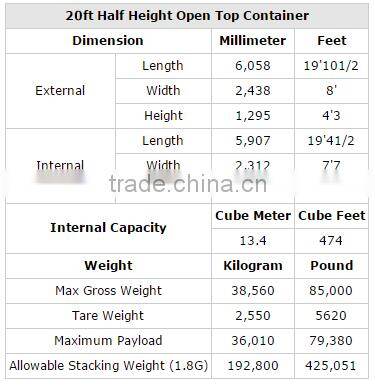 Specifications of 20' OT half height shipping containers