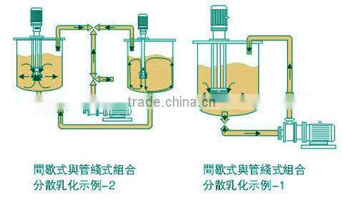 The pipeline type high shear dispersing emulsifier is the high performance equipment used for continuous production and circular processing of fine materials. Inside the narrow space of its chamber, it is assember with 1-3 groups of dual-geared stators and rotors of mulsifier. The materials are sucked