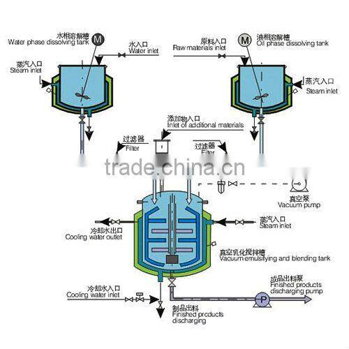 5)Mightiness balance isotactic curve rotor is matched with stator with corresponding structure to realize liquild high-capability cut ,rubbing,centrifugal to make sure exquisite and slick cream ; boiler body and pipe surface mirror polishing 300EMSH(sanitation grade) accords with Daily Chemical and GMP regulation .