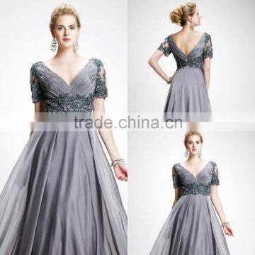 Autumn Style Elegant V-Neck Smooth Lace Short Sleeve Floor Length Evening Gown