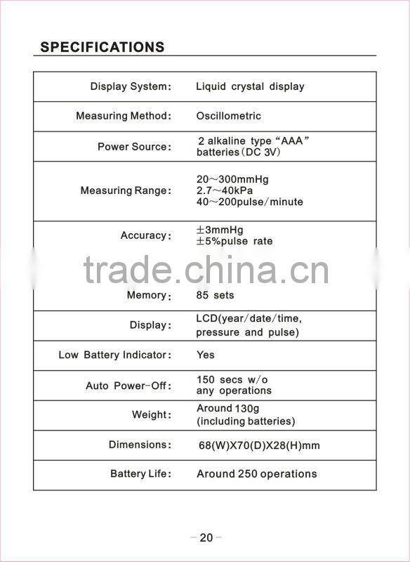 3)Range: 20-300mmHg(Pressure); 40-200beats/min(Pulse Rate)