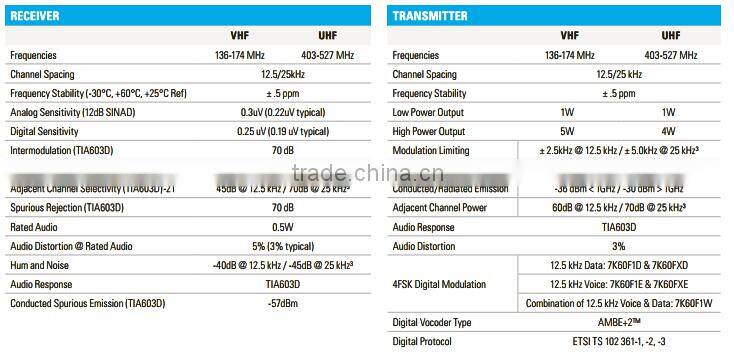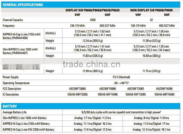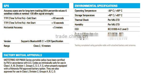 P8600 Series radios meet the most demanding specs, including IP57 for water submersibility and U.S. Military Standard 810 C, D, E, F, & G for exceptional durability. P8600 radios have a two-year Standard Warranty with 1-year warranty for batteries and accessories. In addition, Service from the Start provides multi-year peace of mind with fast repair turnaround times, expert telephone technical support and access to the latest software releases2; all backed by Motorola’s globally integrated services infrastructure, highly qualified support technicians and certified repair facilities.
