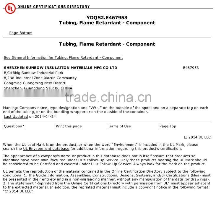 Our main products include fiberglass sleeving, silicone rubber tube, PVC tube, heat shrink tube, PTFE/FEP tube and so on. All our fiberglass sleeving had been obtained the UL and CSA certificates in 2010 (Cert No: E333178--UZIQ2, VW-1 for flame resistance requirement & E333177--UZFT2/8, 200C, 600V for thermal resistance requirement); Our heat shrink tube, silicone rubber tube and PTFE tube had been obtained UL certificate in 2013 (Cert. No. E360625); PVC tube had been obtained the UL certificates In in Apr.2014 (Cert.No.E467953); In May. 2012, our products successfully had been passed CQC test (Certificate No. CQC12134072554). It provides security for domestic and foreign home appliance supplier in Chinese mainland market. Till now, we are the only one fiberglass sleeving manufacturer which obtained UL, CSA, and CQC certificates. Also we are the only one manufacturer which can provide certificates for all color and maximum size range (from 0.55mm to 25.4mm). Also all our products are in conformance with the European RoHS requirements, furthermore, based on European new requirements, we re-applied and obtained German PFOA and PFOS certificates and European Reach report.